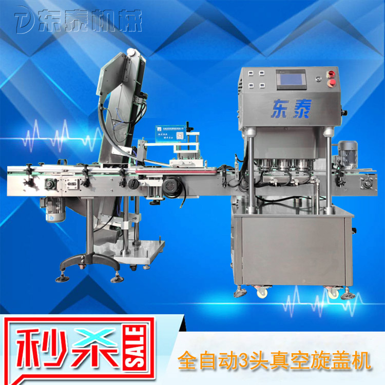 該直線式真空旋蓋機是東泰機械結(jié)合用戶使用的情況,摒棄了傳統(tǒng)轉(zhuǎn)盤式真空旋蓋機的弊端,研制開發(fā)的新型高效設(shè)備,設(shè)備自動檢測到兩個瓶子蓋子進入到雙頭真空旋蓋機內(nèi),旋蓋機彩色顯示屏?xí)崟r顯現(xiàn)旋蓋狀況,整機多點檢測,當進口無瓶無蓋、出口堵塞、定位不準、瓶身傾倒均自動停機。單個旋蓋頭達到的真空度都可以單顯示,單調(diào)整