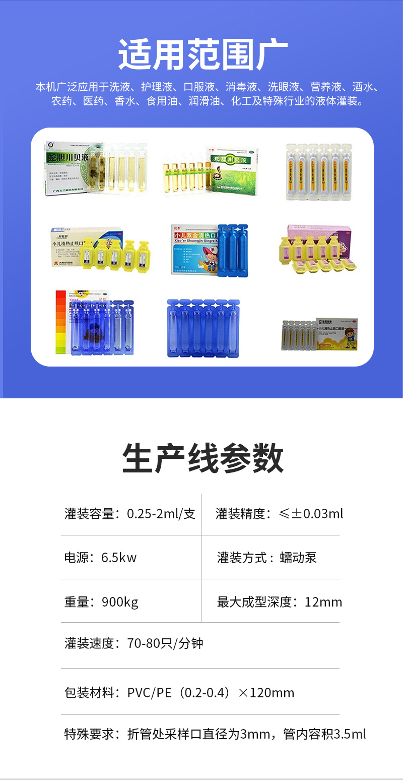 易折試劑管成型灌裝機廣泛使用于護理液、口服液、洗眼液、營養液、香水、食用油、潤滑油、化工及特殊行業的液體灌裝。